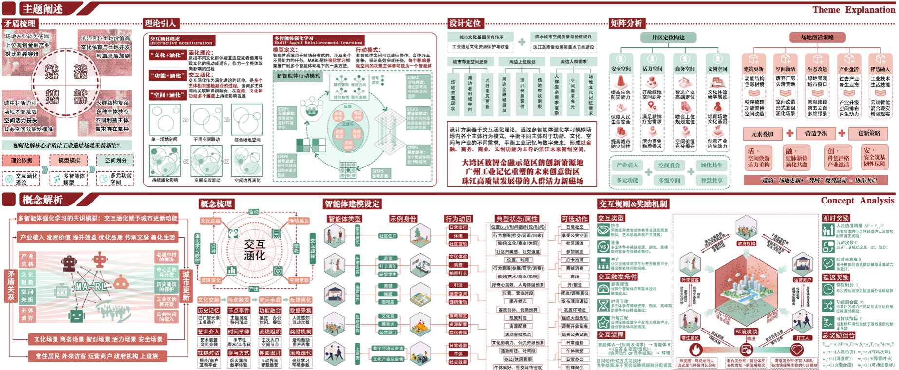 作品聚焦于当前城市发展中普遍面临的工业遗址更新挑战。在项目研究中创新性地引入文化传播学中的“交互涵化理论”,探讨工业遗存与当代城市文化如何在双向互动中实现价值重构与共生发展。同时,借助前沿的多智能体强化学习技术,构建了动态模拟系统,探索工业遗址区域与城市肌理的融合的最佳空间组合形式。