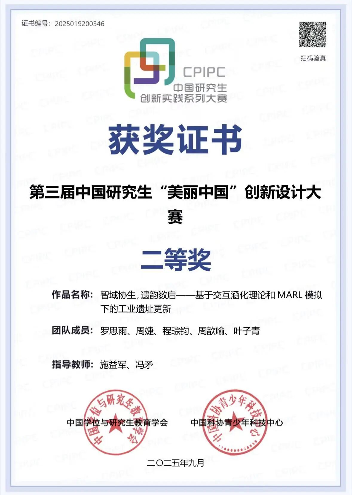近期,第三届中国研究生“美丽中国”创新设计大赛总决赛在黑龙江大学圆满落幕。大赛是由教育部学位与研究生教育司指导,中国学位与研究生教育学会、中国科协青少年科技中心主办的“中国研究生创新实践系列大赛”主题赛事之一。在此次大赛中,我院施益军副教授和冯矛老师指导,研究生罗思雨、周婕、程琮钧、周歆喻、叶子青团队所提交的作品《智域协生,遗韵数启——基于交互涵化理论和MARL模拟下的工业遗址更新》荣获全国二等奖。