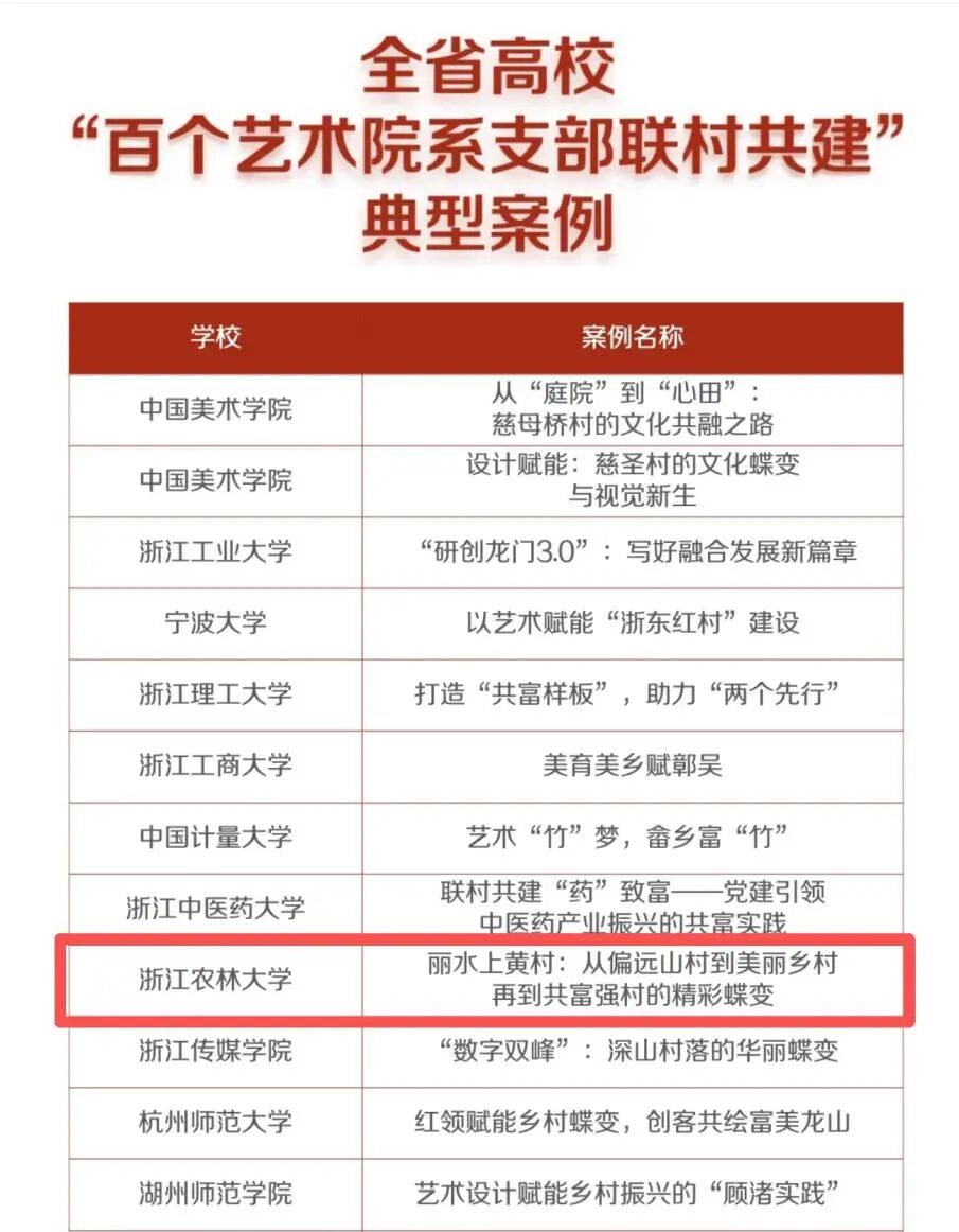 近日,省委教育工作委员会公布了全省高校“百个艺术院系支部联村共建”典型案例评选结果,风景园林与建筑学院城乡规划学学科教工党支部报送的《丽水上黄村:从偏远山村到美丽乡村再到共富强村的精彩蝶变》案例成功入选。这一荣誉是对该支部坚持以高质量党建引领服务乡村振兴战略,深度参与地方发展、实现校地共赢实践的充分肯定,生动诠释了高校基层党组织在新时代的使命担当。