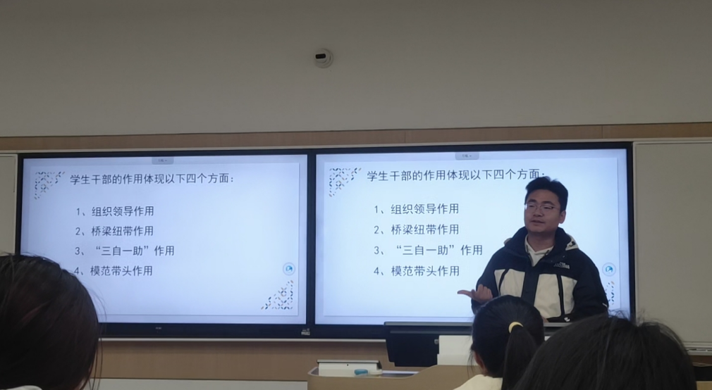 课堂上,吴老师围绕学生干部核心素养与工作实践展开系统性讲解,内容涵盖学生干部的内涵界定、必备素质与核心能力、职能定位与作用发挥、现存问题剖析及常用工作方法等关键模块。讲解过程中,吴老师融入优秀领导人实践案例,深度分享工作经验并提出针对性建议,重点阐释了新时代大学生成长成才的核心要求,以及如何科学统筹学习、工作与生活的关系。