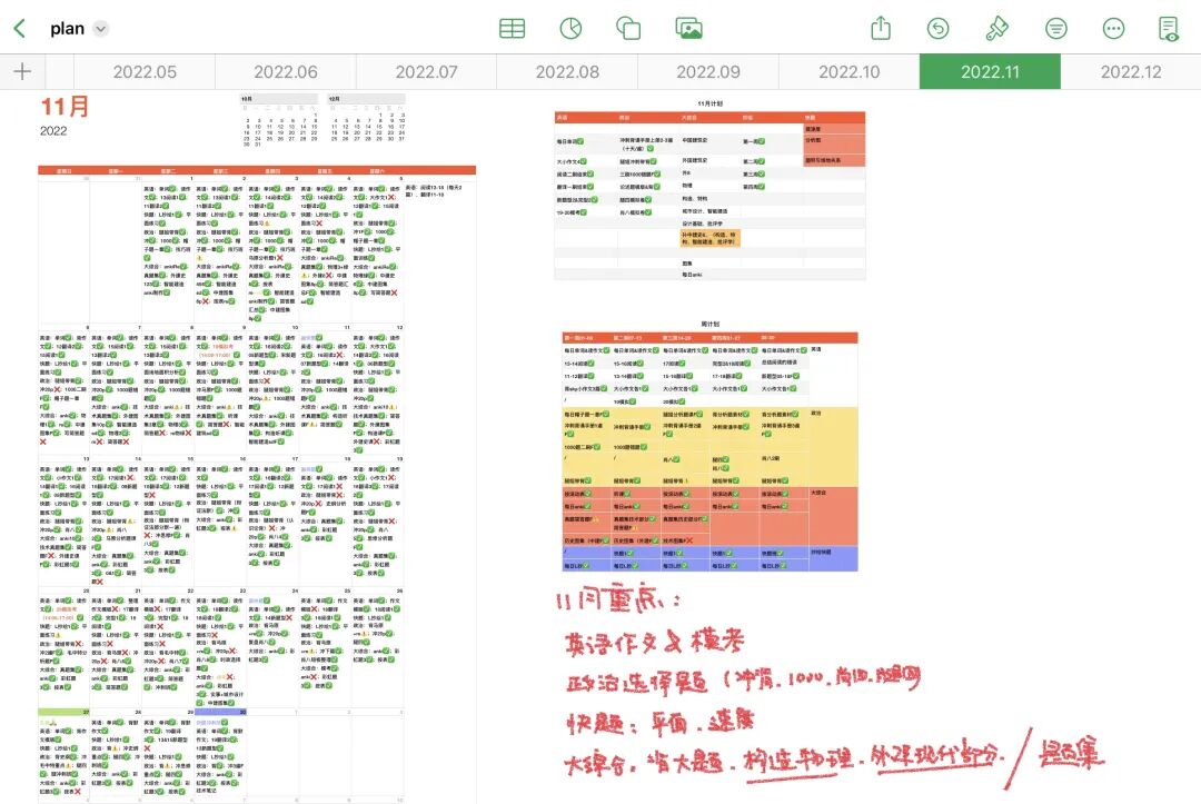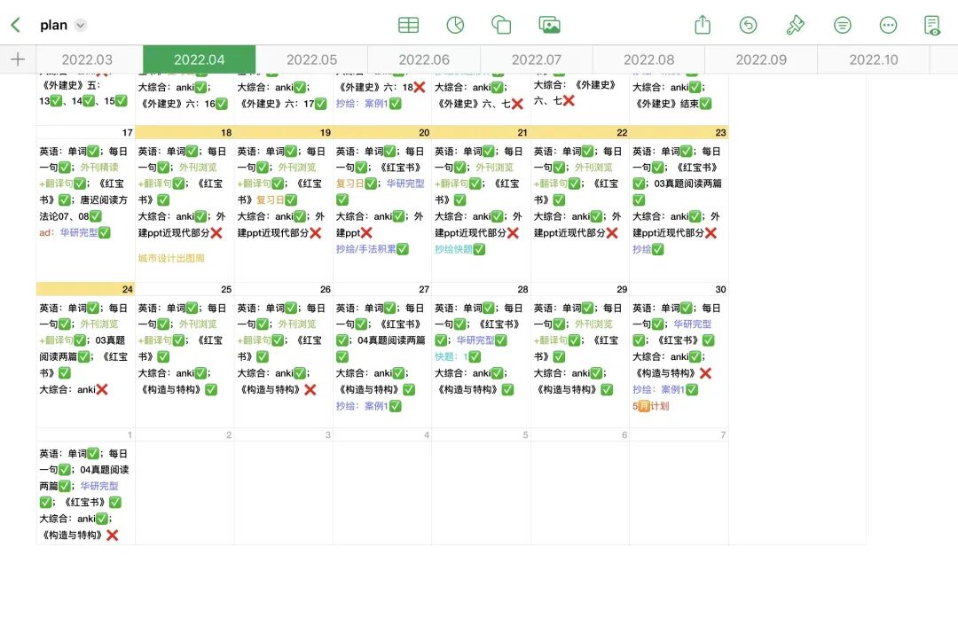 年计划之后再详细落到月计划、周计划上,不需要太过详尽,具体执行的时候需要进行灵活调整,但要保证把每个阶段的任务做好。她只会给自己制定每天的任务,没有固定什么时间一定要学什么,有时候不想学这一项了就换一项学,状态不好不必死磕。每天的任务不一定能100%做完,有时候也甚至会有打好几个叉叉的情况出现,但基本会保证每周的任务不会被拖到下一周,这样也能留给自己最大的自由度。