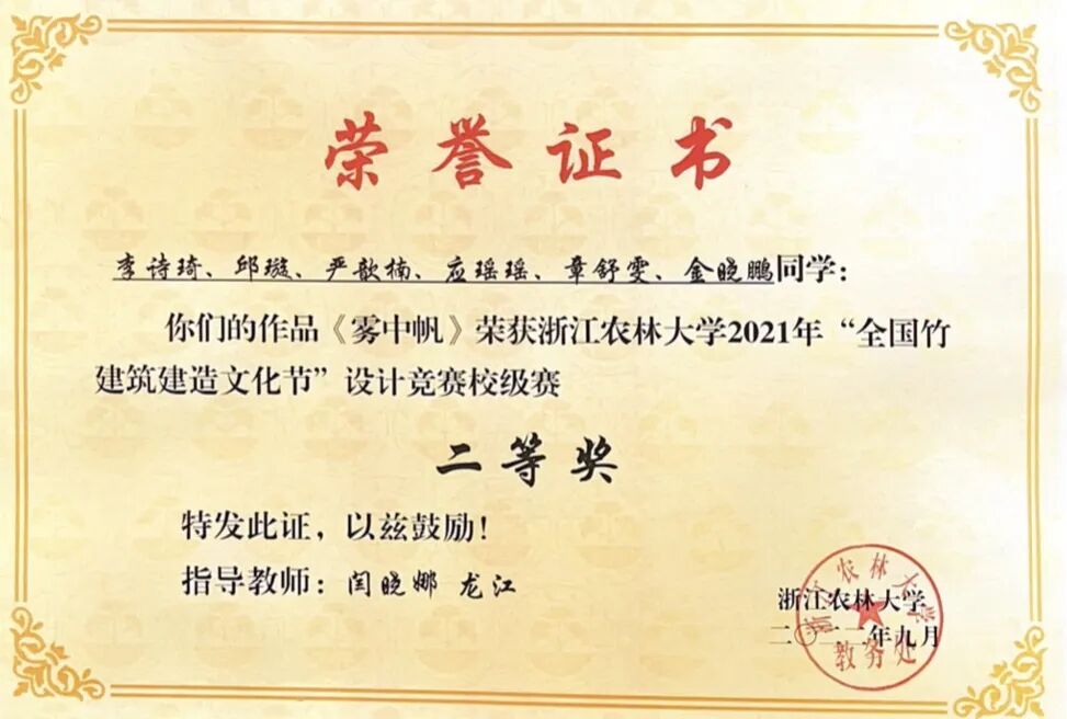 曾荣获第十四届工程技术成图及创新假模大赛尺规类竞赛二等奖、浙江农林大学2021年“全国竹建筑建造文化节”设计竞赛二等奖、莫干山民宿微改造创客大赛最佳创意奖和最佳人气奖、浙江农林大学文体活动奖等奖项。