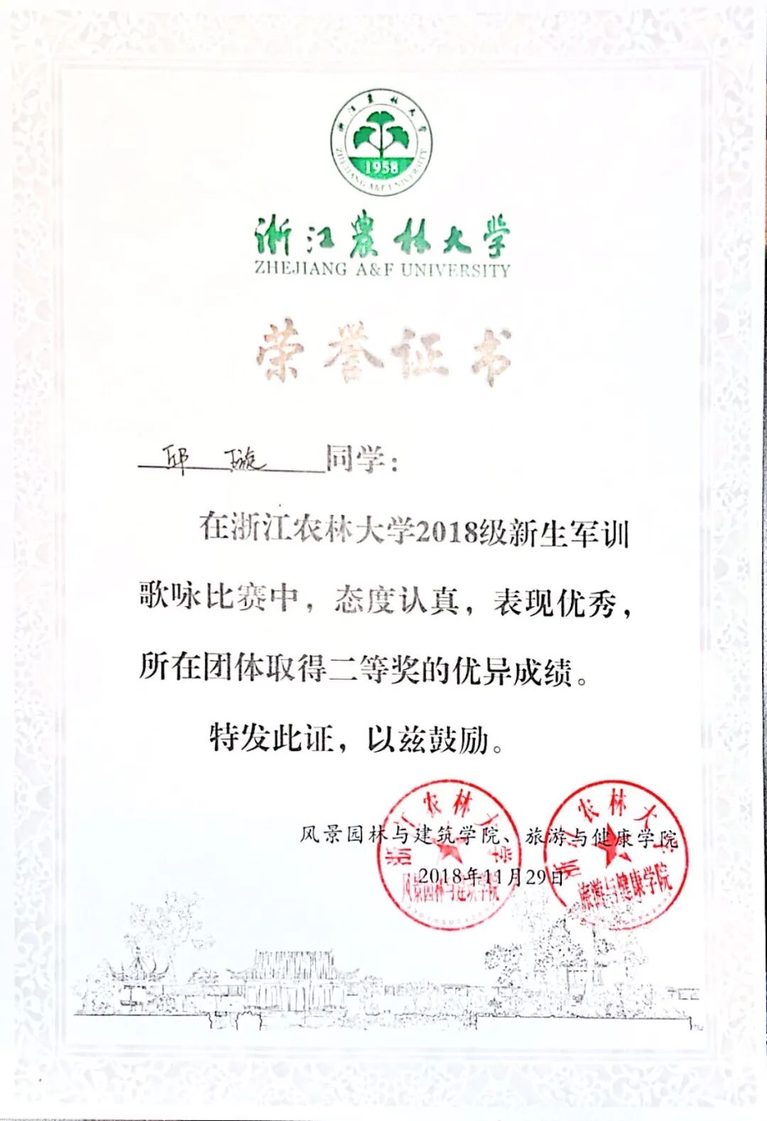 本科期间曾任林子晨光志愿者协会干事和建筑学181班学习委员。