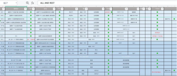 这时,大家已经有了全天的复习时间,要特别注重时间规划,实现劳逸结合。从宏观到微观,逐步将月计划、周计划、日计划详细展开,再明确要实现计划所需要付出的劳动和具体任务的时间分配,每晚检查计划完成情况,适当予以调整。这时,在全天的复习下,大家很容易感到疲惫,要及时给自己安排休闲放松的时间。备考期间,她每周都会安排“休息日”,在学习计划完成后跟朋友打打球、跑跑步、出门聚餐,通过这些来缓解疲乏、放松紧绷的神经。