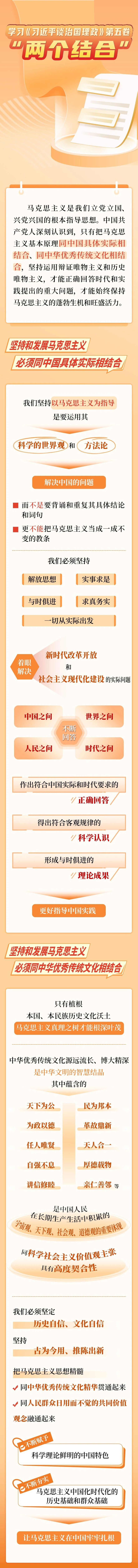 习近平新时代中国特色社会主义思想的一项重大原创性贡献,就是把马克思主义中国化时代化的途径和方法由“一个结合”发展为“两个结合”。 《习近平谈治国理政》第五卷深刻阐释了“两个结合”的丰富内涵和实践要求,全方位呈现习近平新时代中国特色社会主义思想是坚持把马克思主义基本原理同中国具体实际相结合、同中华优秀传统文化相结合取得的重大理论创新成果这一历史性结论。一起学习 ↓